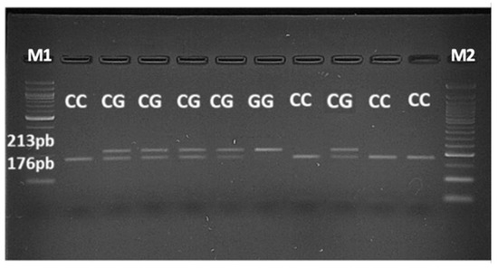 After a restriction enzyme digestion with MboI enzyme, a gel electrophoresis analysis was performed to test if the JAK2 46/1 haplotype existed in patients. Thus, JAK2 rs10974944 SNP was used as tag SNP to identify the haplotype. The aim of this analysis was to evaluate the presence of the rs10974944 (G) allele, as well as the heterozygous condition (G/C) and the common allele (C/C) (Figure 5).