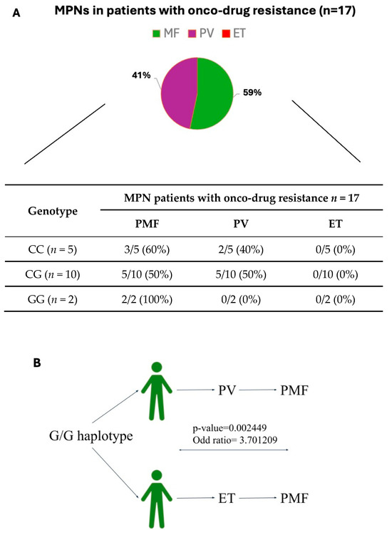 (A) This graph shows the distribution of MPNs in patients with onco-drug resistance (n = 17) and their classification according to their genotype and their MPN disorders. (B) Schematic representation, showing how G/G haplotype correlates with PMF evolution starting from different MPNs. p value < 0.01 was set as the threshold for statistical significance.