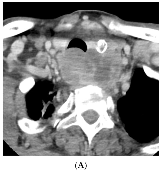 - Yamauchi, M.; Sakai, A.; Ebisumoto, K.; Iijima, H.; Teramura, T.; Yamazaki, A.; Yanagiya, R.; Yamamoto, A.; Ota, Y.; Ashida, H.; et al. Combination therapy with BRAF and MEK inhibitors for anaplastic thyroid cancer: A report of two cases. Auris Nasus Larynx 2024, 51, 1003–1008. [Google Scholar] [CrossRef]