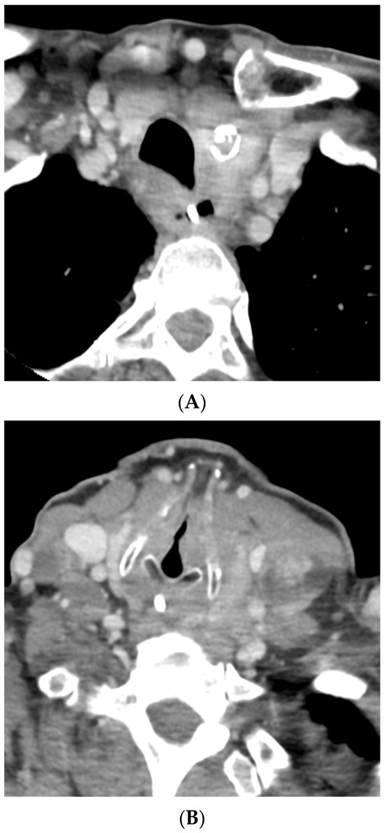 - Kuriakose, J.P.; Khan, N.; Suresh, N.V.; De Ravin, E.; Moreira, A.; Rajasekaran, K. Treatment and Management of Anaplastic Thyroid Carcinoma: Appraisal of Clinical Practice Guidelines. J. Laryngol. Otol. 2024, 1–24. [Google Scholar] [CrossRef] [PubMed]