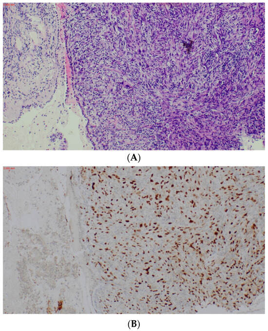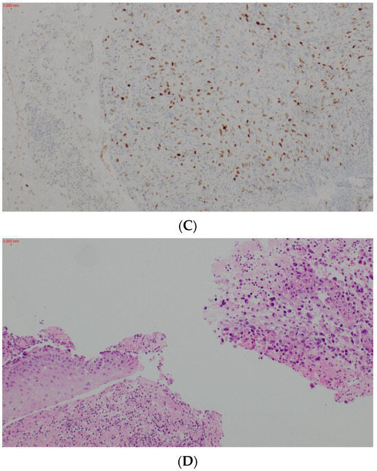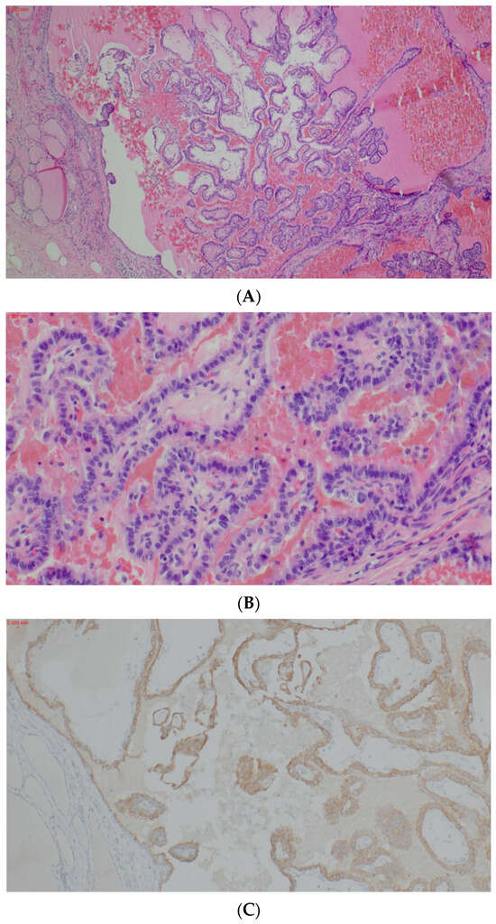 (A–C): Hematoxylin and Eosin (H&E) stain of the resected papillary thyroid carcinoma ((A) = H&E at 4× magnification; (B) = H&E at 20× magnification; (C) = BRAF immunostain at 10× magnification).
