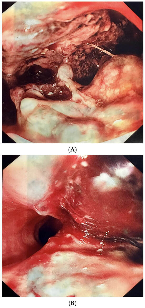 Gastroscopy demonstrated necrotic debris at the site of fistulation with an overlying clot (A). The clot was removed using suction. Fistulation was confirmed by passing an endotracheal tube and passing air bubbles via gastroscopy (not pictured). Bubbling was then noted on bronchoscopy, thus demonstrating the passage between the two viscera. Bronchoscopy demonstrated an adherent clot over the site of fistulation (B).
