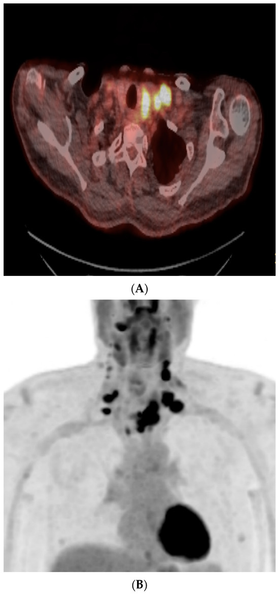 MRI 4 weeks later demonstrated a sustained treatment response. Three weeks later, FDG-Positron Emission Tomography (PET) CT demonstrated uptake in the left lobe of the thyroid gland, bilateral cervical lymph nodes, and superior mediastinal lymph nodes (shown in Figure 5). Subsequent MDM discussion recommended radical thyroidectomy based on data from cohort studies showing improved outcomes [16,17].