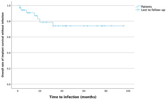Some studies have associated a higher BMI with an increased risk of PJI following primary arthroplasty of the hip or knee [], but there are not many reports on PJI and BMI following megaprosthesis implantation. For instance, Fujiwara et al. [] analyzed 121 patients who underwent tumor prosthesis of the lower limb after resection of musculoskeletal tumors and found no association or trend between higher BMIs and PJI. In our cohort, though, PJI tended to occur in patients with a higher BMI (26.0 ± 4.0 vs. 22.3 ± 3.6), and the results were statistically different (p = 0.003). Considering the results in primary arthroplasties and the tendency we verified here, we believe a bigger cohort is mandatory to definitively state this association.