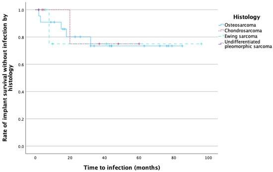 PJI occurred in eight osteosarcomas, two chondrosarcomas, two Ewing sarcomas, one fibrosarcoma, and the one pleomorphic sarcoma (p = 0.385) (Figure 2).
