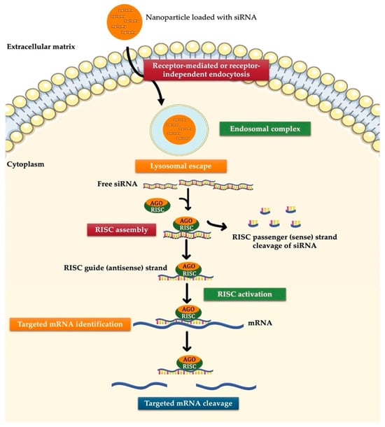 The success of nanoparticle-based delivery systems is contingent on efficient cellular uptake and the ability to release their therapeutic payloads within the target cells []. Many nanoparticles exploit receptor-mediated endocytosis to enter cancer cells by targeting overexpressed receptors such as transferrin or folate receptors. Once internalized, these systems must escape the endosomal compartment to release their siRNA payloads into the cytoplasm (Figure 3), where RISC can process and execute gene silencing [,,]. pH-sensitive nanoparticles can trigger endosomal escape by destabilizing the endosomal membrane in response to acidic environment, facilitating siRNA release into the cytoplasm [,,]. Cationic lipids, frequently used in LNPs, also promote endosomal escape through mechanisms like membrane fusion or pore formation, enhancing the bioavailability of siRNA inside the target cells [,].
