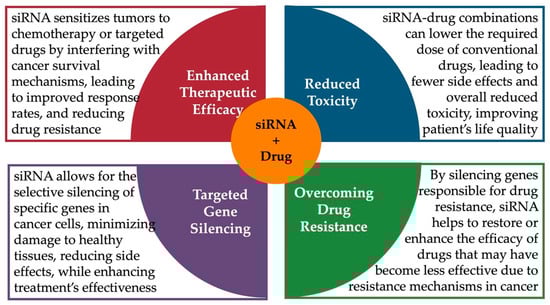 Moreover, therapeutic doses of chemotherapy are frequently associated with systemic toxicities, including myelosuppression, neurotoxicity, cardiotoxicity, and gastrointestinal complications [,]. The combination of siRNA and anticancer drugs allows for dose reduction while maintaining therapeutic efficacy, as siRNA enhances the drugs’ tumor-specific action [,,] (Figure 2). As an example, siRNA targeting VEGF, when combined with paclitaxel, enhances tumor response by inhibiting angiogenesis, enabling lower doses of the cytotoxic agent [,]. This reduction in dose may alleviate the adverse effects commonly seen with standard chemotherapy regimens.