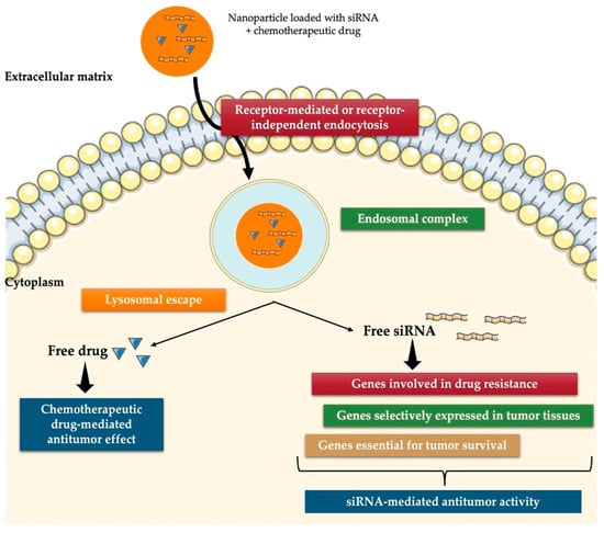 Mechanism of action for siRNA-drug combination therapy in cancer treatment. The nanoparticles are engineered to carry both siRNA and chemotherapeutic agents, facilitating targeted delivery to cancer cells. These nanoparticles are taken up by tumor cells through receptor-mediated or receptor-independent endocytosis. Once inside the cell, these systems must escape from the endosomal complex to prevent degradation in the lysosomes. Successful escape releases both siRNA and the chemotherapeutic drug into the cytoplasm. On the one hand, the (free) siRNA silences specific genes involved in tumor survival proliferation or drug resistance by binding to mRNA and preventing protein synthesis. This gene silencing inhibits critical pathways for cancer cell growth and survival, such as genes uniquely expressed in tumor tissues or those involved in resistance mechanisms. On the other hand, the released chemotherapeutic drug exerts its antitumor effect, attacking cancer cells through traditional cytotoxic mechanisms. The combination of siRNA-mediated gene silencing and drug-induced cytotoxicity enhances the overall therapeutic efficacy, helping to overcome drug resistance and improve patient outcomes. This dual approach also targets tumors more precisely while minimizing off-target effects and damage to healthy tissues.
