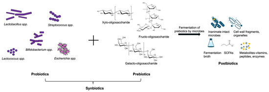 Different types of prebiotics, probiotics, synbiotics, and postbiotics. Synbiotics refer to the combination of probiotics, that include different bacterial species, and prebiotics, that include non-digestible dietary fibers. Postbiotics include a wide variety of substances such as bacterial components, short chain fatty acids (SCFAs), metabolites, and fermentation broths.