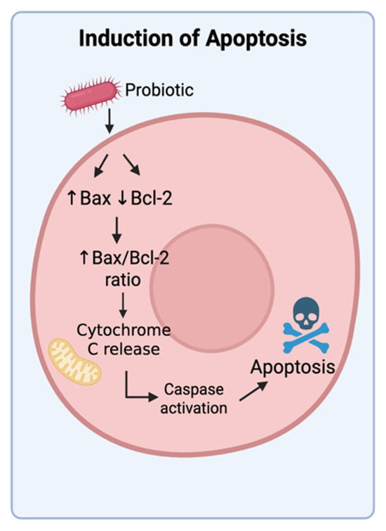 Induction of apoptosis by probiotics. Probiotics can promote apoptosis in cancer cells by increasing the expression of pro-apoptotic Bax and anti-apoptotic Bcl-2. This increase in the Bax/Bcl-2 ratio activates the intrinsic pathway of apoptosis by releasing cytochrome c from the mitochondria, resulting in activation of caspases that induce apoptosis. Created in BioRender. Tafla, T. (2025) https://BioRender.com/723nhcu (accessed on 10 August 2025).
