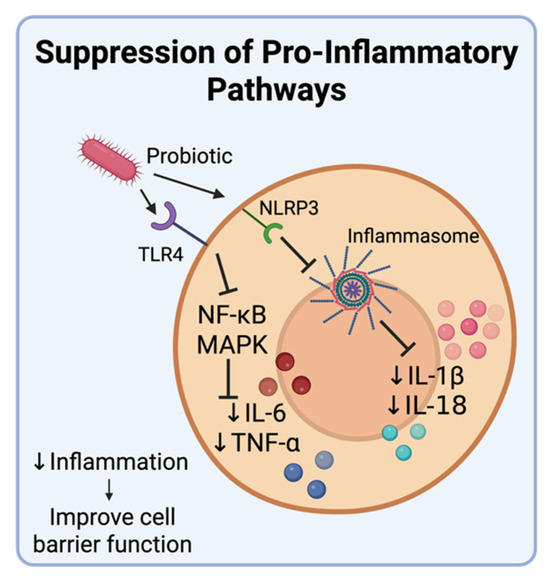 Suppression of pro-inflammatory pathways by probiotics. Probiotics inhibit the production of pro-inflammatory cytokines like IL-6, TNFα, IL-18, and IL-1β by inhibiting the MAPK signaling pathway and suppressing activation of the pattern recognition receptor NLRP3 as well as transcription factor nuclear factor κB (NF-κB). Created in BioRender. Tafla, T. (2025) https://BioRender.com/4eq1l9s (accessed on 10 August 2025).