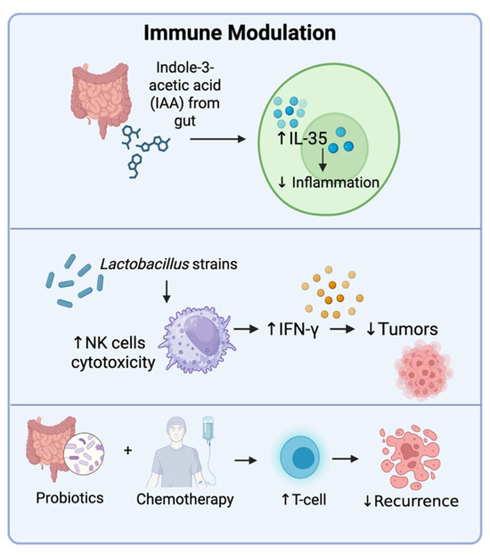 Modulation of immune responses by different biotics. Probiotics can modulate immune cell function by creating metabolites like IAA that upregulate the expression of IL-35, resulting in reduced inflammation. Some probiotics can increase the cytotoxic properties of natural killer (NK) cells and induce the production of interferon γ (IFN-γ) that activates immune cells and reduces tumor growth as well as the recurrence of tumors. Created in BioRender. Tafla, T. (2025) https://BioRender.com/jefc17f (accessed on 10 August 2025).