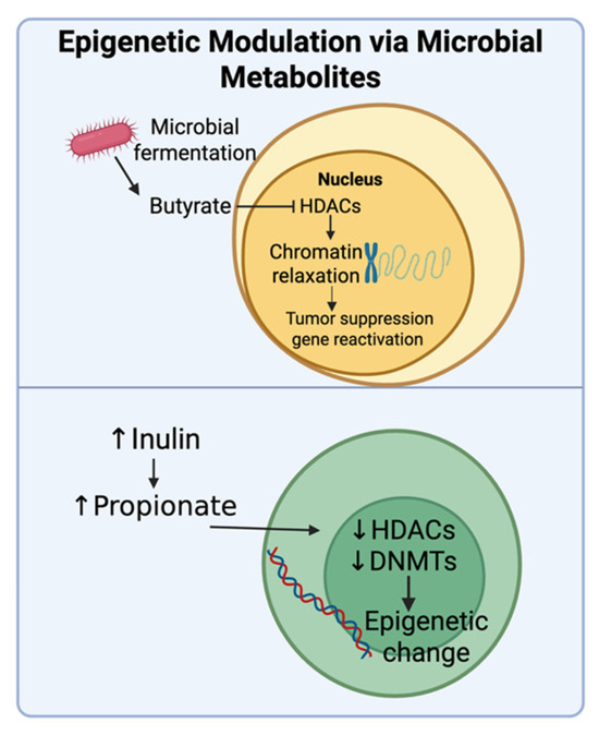 Postbiotics like butyrate and propionate that are generated through microbial fermentation of different substances, including inulin, inhibit histone deacetylases (HDACs) and DNA methyltransferases (DNMTs). This results in epigenetic changes such as the expression of tumor suppressor genes that promote anti-cancer effects. Created in BioRender. Tafla, T. (2025) https://BioRender.com/6yqzqem (accessed on 10 August 2025).