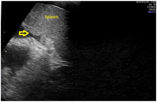 Using transabdominal ultrasound, the mid and upper abdomen can be assessed. Ultrasound evaluation of the abdominal cavity should be systematic., assessing all intrabdominal organs and viscera such as kidneys, adrenal glands, spleen, liver, and pancreas, searching for focal or diffuse intraparenchymal lesions or capsular infiltration (Figure 4).