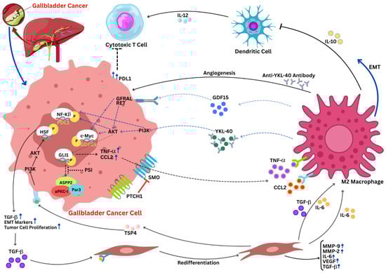Oncogenic pathway in gallbladder cancer: an interplay. The tumor microenvironment and signaling factors have an interconnection, and they play in a rhythm to promote tumor progression in GBC. M2 macrophages contribute to immune evasion by secreting chitinase-3-like protein 1 (YKL-40), a chitinase-like glycoprotein that has been linked to increased tumor angiogenesis, immune suppression, and malignancy in a variety of cancers, as well as increased PD-L1 expression on tumor cells. M2 macrophages promote extracellular matrix remodeling and EMT by secreting IL-10 and modulating tumor growth, invasion, and lymph node metastasis via anti-YKL-40 antibodies. Additionally, they upregulate IL-6, TGF-β, and MMPs. Through TGF-β and CCL2 signaling, CAFs aid in tumor cell proliferation and increase EMT markers. Integrin α2 and the PI3K/AKT axis both enhance metastatic behavior. Elevated PD-L1 expression on tumor cells implies immune evasion by suppressing cytotoxic T cell activity, and GDF15-GFRAL interactions may control metabolic reprogramming. The upward blue arrows represent the upregulation; doted blue arrows represent the activation pathways; curved blue arrows represent directional signaling; black arrows represent the flow of molecular process; and the hammer-headed arrows represent inhibition. AKT, protein kinase B; CAF, cancer-associated fibroblast; CCL2, C-C motif chemokine ligand 2; EMT, epithelial–mesenchymal transition; GBC, gallbladder cancer; GDF15, growth differentiation factor 15; GFRAL, glial cell-derived neurotrophic factor receptor alpha-like; IL-6, interleukin-6; IL-10, interleukin-10; IL-12, interleukin-12; MMP, matrix metalloproteinase; PD-L1, programmed death-ligand 1; PI3K, phosphoinositide 3-kinase; PTCH1, patched 1; SMO, smoothened; TGF-β, transforming growth factor-beta; TNF-α, tumor necrosis factor-alpha; YKL-40, chitinase 3-like protein 1 (adapted from Tang et al., 2025 []).