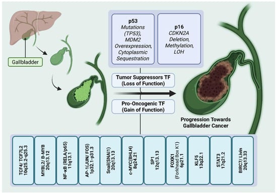 Gallbladder cancer (GBC), a malignancy of the biliary tract, remains a formidable challenge in oncology due to its aggressive nature, late diagnosis, and limited treatment options. It exhibits a striking geographical variation in incidence, underscoring its complex etiology and regional risk factors. Globally, GBC is associated with a dismal prognosis and its association with a high mortality rate, with a median five-year overall survival rate of 5% []. The reported number of new cases of GBC worldwide in 2022 was 122,462 with 89,031 death cases, as per Globocan, 2022 []. In India, GBC is highly prevalent, accounting for nearly 10% of the global disease burden []. There are notable regional variations, with significantly higher incidence rates in the northern and northeastern regions than in the southern states of India. Despite continued research, the underlying molecular mechanisms for GBC pathogenesis in the Indian population remain largely unexplored []. The development of GBC is multifactorial, involving a complex interplay of genetic predisposition, chronic inflammation, gallstone disease or cholelithiasis (especially when left untreated), infections (such as Helicobacter or Salmonella species), and lifestyle choices, which all work together to increase the likelihood of GBC tumorigenesis. Central to this pathogenesis is the dysregulation of transcription factors (TFs), key regulators of gene expression. As essential conductors of gene expression, these TFs regulate a broad variety of cellular processes including proliferation, differentiation, DNA repair, immune response and programmed cell death (Figure 1). Disruption in TF activity is a common molecular event across many cancers, including GBC, and contributes to aberrant transcriptional programs of the downstream cellular programs that drive tumorigenesis. An understanding of the altered expression of these upstream regulatory factors may shed light on the core causes of GBC malignancy [,].