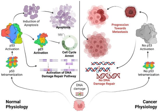 Role of p53 in regulating the cell cycle to maintain genomic integrity. Under normal conditions, p53 is maintained at low levels. In response to cellular stresses such as DNA damage, p53 accumulates and functions as a tetrameric transcription factor, inducing either cell cycle arrest or apoptosis. DNA damage stimulates p53 tetramerization and activation, which facilitates cell cycle regulation and the maintenance of genomic integrity. Activated p53 binds to specific response elements upstream of target genes such as p21, leading to cell cycle arrest and activation of the DNA repair machinery, primarily via ATR/ATM kinase pathways. When DNA damage is irreparable, p53 triggers the expression of pro-apoptotic genes such as Bax and Bak to initiate apoptosis. In contrast, under carcinogenic conditions, mutations in various domains of p53 impede its stabilization and tetramer formation, resulting in p53 inactivation. Some p53 mutants with a functional tetramerization domain can form mixed tetramers with wild-type p53, exerting dominant-negative effects (DNE) that further inactivate p53, ultimately contributing to genomic instability and metastasis. Black arrows represent the flow of molecular process; and the hammer-headed arrows represent inhibition.