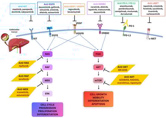 Targeted therapeutic strategies and key signaling pathways in gallbladder cancer. Schematic illustration of major receptor tyrosine kinases (KIT, EGFR, VEGFR, ERBB2, PD-1/PD-L1, and c-MET) and their downstream signaling cascades implicated in GBC progression. Activation of these receptors drives the RAS signaling and AKT signaling regulating cell cycle progression, proliferation, differentiation, cell growth, mobility, differentiation, and apoptosis. Various inhibitors belonging to anti-KIT, anti-EGFR, anti-VEGF/VEGFR, anti-PD-1/PD-L1, and anti-c-MET directly target these tyrosine kinase receptors. Additionally, small-molecule inhibitors against intracellular signaling components like anti-RAS, anti-RAF, anti-MEK, and anti-AKT/mTOR directly target the downstream targets of these signaling pathways. Together, these therapeutic approaches highlight potential avenues for targeted and immune-based interventions in GBC. Doted blue arrows represent the activation pathways; black arrows represent the flow of molecular process; and the hammer-headed arrows represent inhibition.