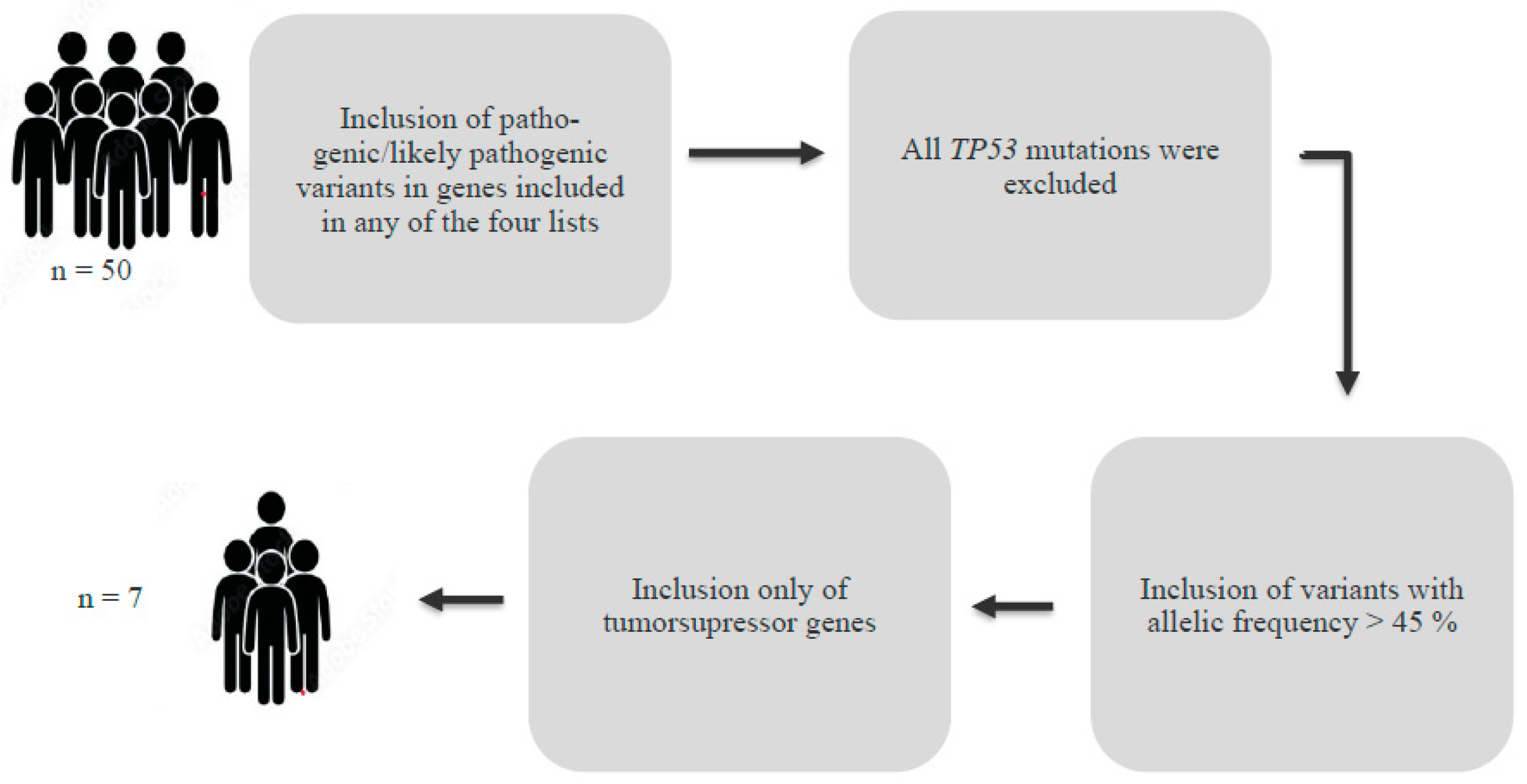 - Kuzbari, Z.; Bandlamudi, C.; Loveday, C.; Garrett, A.; Mehine, M.; George, A.; Hanson, H.; Snape, K.; Kulkarni, A.; Allen, S.; et al. Germline-focused analysis of tumour-detected variants in 49,264 cancer patients: ESMO Precision Medicine Working Group recommendations. Ann. Oncol. 2023, 34, 215–227. [Google Scholar] [CrossRef] [PubMed]
