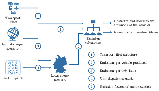 The combination of scenario analysis in energy and transport and LCA is a recent development. Various publications have already shown and investigated the integration of LCA in the assessment of systems [17,18,19,20,21]. These describe fundamental principles and challenges in the integrated consideration of energy system analysis and LCA. Among other things, the problem of double counting emissions in the assessment of systems is described and solutions are outlined. Double-counting describes the problem that a process to be evaluated already exists in the upstream chain. In this case, for example, this could be a transport service. An important aspect in the prospective analysis up to 2050 is also the changes in the background data. Background data describes data that depicts the upstream chain but is not the focus of the analysis. In this instance, LCA databases are usually used. In terms of changing background data Mendoza Beltra et al. has laid the groundwork [22]. The model carculator, a python-based extension of brightway2, makes use of the change of background data to conduct prospective analyses for vehicles [23].