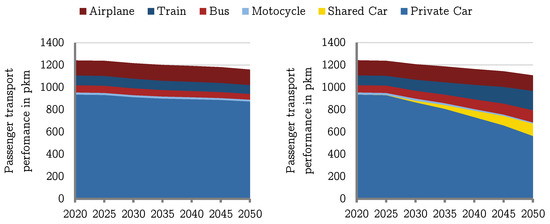 If looking at the CSI scenario, one can see that after 2025 the share of transport performance by private cars decreases as it is shifted to a combination of shared cars and public transport such as buses and trains. For this purpose, potentials for users of multi-modal transport in urban and rural areas are derived on the basis of the mobility study Mobility in Germany [31]. In the CSI scenario, these potentials are exploited to the maximum. A detailed explanation of the development of the scenario is given in [32].