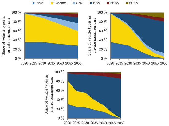 Technology split for privately owned cars in the conservative (top left) and the ambitious (top right) scenario as well as the technology split of the shared cars in both scenarios (bottom).