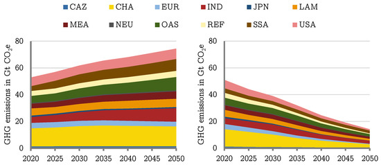 GHG emissions of the global energy scenarios Base (left) and ClimPol (right); own illustration based on [22,28].