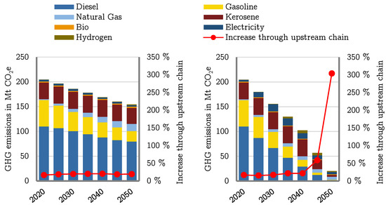 The results relating to emissions in the operational phase are used to compare the two methods, as these are the only emissions accounted for by the original method. This also provides an insight into which energy sources are responsible for the largest shares of emissions. For this purpose, the resulting GHG emissions caused by the operational phase in the scenarios Ref-Base and Ref-ClimPol are plotted in Figure 5. In addition, the diagram includes the increase in emissions due to the integration of upstream chain emissions in the provision of energy sources in comparison to the evaluation without considering the provision of primary energy carriers as well as the production of the energy conversion technologies such as e.g., photovoltaic modules.