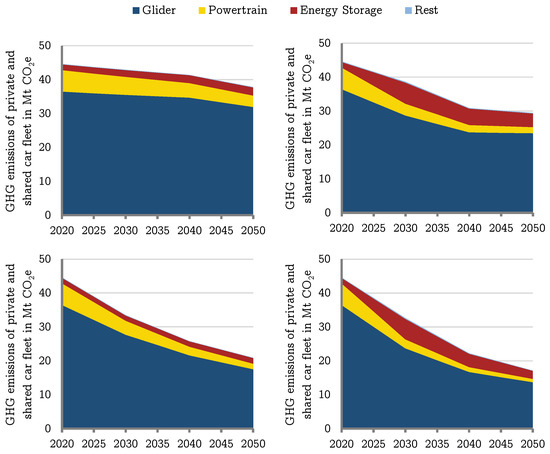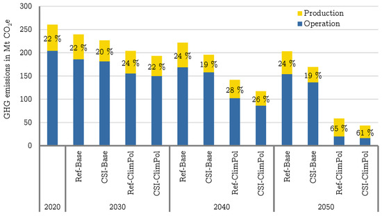 The specific emissions from the production of the glider of the various drive technologies do not differ greatly. Thus, the absolute emissions attributable to the glider are essentially related to the absolute number of passenger cars. The total passenger car fleet with private and shared vehicles contains 42.3 million cars in the scenarios Ref in the year 2050. The CSI scenario, on the other hand, with a strong trend towards car sharing embedded in an intermodal transport system, requires a total of 25.2 million vehicles in 2050. Compared to their conventional counterparts, the scenarios CSI result in a reduction of emissions from the production of the glider of 54.7% and 58.5%, respectively. The effects in the comparison between the two mobility scenarios Ref and CSI are thus more evident than those of the two energy and technology scenarios Base and ClimPol.