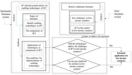 To implement the objective of the current paper, two approaches were employed, as indicated in Figure 1. First, a systematic literature review (SLR) was undertaken to describe the state-of-the-art and applications of enabling technologies in IFT. From this analysis, the application of technologies that are components of IFT and their pre-conditions were synthesized. Additional gray literature was reviewed to characterize IFT in low and high-income economies. The outcomes of the characterization were the identification of IFT and key challenges in low-income countries. Then, these outcomes were used as an input for selecting the potential applications of technologies in these countries. The technological applications were assessed as to whether or not they address the key challenges in low-income countries. Then, their characteristics and pre-conditions were checked to establish whether they fit with IFT in the context of low-income countries.