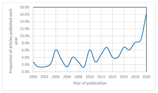 Distribution of articles identified from a systematic literature review over the years 2000–2020.