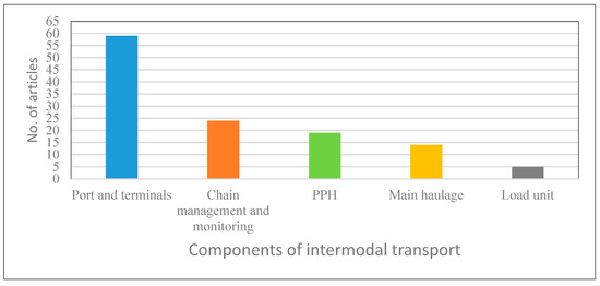 In view of the classification of components in intermodal transport from the literature, five components were identified: ports and terminals, chain management and monitoring, pre- and post-haulage (PPH), main haulage, and load unit. Ports and terminals refer to the point at which a change in means of transport occurs. The chain management and monitoring component concerns the timely communication of information along the whole chain. PPH covers the movement of goods to/from ports from/to the warehouses of clients. The main haulage is the section that covers the longest portion of transport and is carried out using massive means of transports such as trains, ships, or planes. Load unit is the means of keeping goods in a single unit. Figure 3 shows that most papers focused on ports and terminals, which was followed by chain management and monitoring. Very few papers discussed the load unit component.