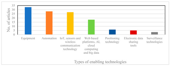 Enabling technologies found in the literature included equipment, automation and artificial intelligence (AI), web-based platforms and big data, sensors and wireless communication technology, electronic data-sharing tools, and surveillance technologies. The number of articles discussing the corresponding technologies are shown in Figure 4.