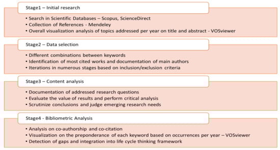 The major source of materials for this literature review is a collection of scientific papers, books, journals, and technical reports. The first stage of the adopted methodology consisted of performing initial research, deliberately broad. As a search engine and database, this work relies on ScienceDirect, Scopus, and other available online tools—such as Mendeley Desktop [29] and Web of Science [30]—to acquire and select the resources for research while collecting them in a reference manager [31,32]. The software application VOS Viewer [33] was then used to obtain an overall visualization of addressed topics, which configured a first bibliometric analysis of the collected materials. Other tools such as websites were occasionally used to collect, choose, and treat the resources, for instance, to check for co-citation or cross-referencing.