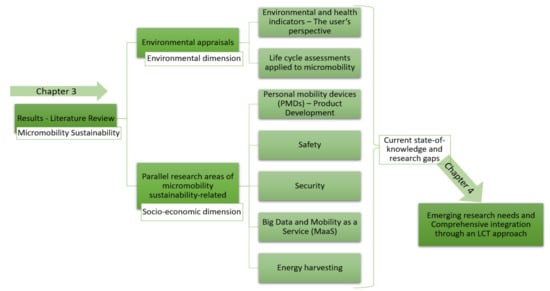 The structure of the paper is the following: Section 2 describes the materials and methods used, followed by the literature review results. Section 3 is divided into two sub-sections: Section 3.1, Environmental Appraisals, and Section 3.2, Parallel Research Areas of Micromobility Sustainability—Socio-Economic Appraisals. In Section 3.1, we review the LCA studies related to micromobility vehicles, focusing on indicators such as energy consumption and GHG emissions, not before highlighting the users’ perspectives on noise and pollution exposure. The second sub-section reveals the reviewed work in inherent areas related to the micromobility transport system and its socioeconomic sustainable integration. As the initial figure of Section 3 shows, it leads to the identification of emerging research areas, which are included in the proposal of an LCT framework. Both are presented in the discussion (Section 4), before concluding in Section 5.