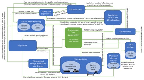The environmental appraisals section of the literature review suggests that the LCT of micromobility includes R&D needs in many areas, from the standpoint of users’ health improvements or from the standpoint of environmental sustainability. From the perspective of the socioeconomic dimension of sustainable integration, micromobility inevitably relates to research on how society engages in new business models, how infrastructures give a sense of safety to the vulnerable road users, how digitalization confers a sense of security to the system, or how renewable energy sources penetrate the system. Hence, in Section 3.2.1, Section 3.2.2, Section 3.2.3, Section 3.2.4 and Section 3.2.5 we reveal studies and identify research gaps related to PMD manufacturing or product development, security, safety, the inclusion of micromobility under the MaaS concept, big data treatment, and energy harvesting.