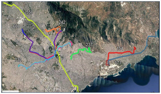The dataset received by the Athens Urban Transport Organization (OASA S.A.) includes spatiotemporal GPS data and archived data obtained by an APC system for the seven following bus lines: 154 (St. Elliniko—A. Glyfada—Pan/ma Voulas), 237 (Ano Ilioupoli—St. Dafnis), 242 (St. Katechaki—Polytechneioupoli), 732 (Ag. Fanourios—Akadimia—Z. Pigi), 171 (St. Elliniko—Varkiza), 550 (P. Faliro—Kifisia), and 608 (Galatsi—Akadimia—Nekr. Zografou). The route type, length, number of bus stops—from origin to destination and from destination to origin—and the period the data were collected are summarized in Table 1. For circular lines there is no differentiation between the number of stops, as the origin is also the destination. The bus lines are visualized in Figure 1.