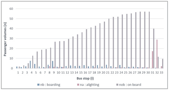 The average occupancy rate () of the bus is calculated in Equation (2).