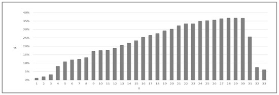 In this study, we employ APC data from different bus lines that are part of Athens’ public transportation system in order to assess the provided Quality of Service. Our perspective is not only to cover the route of the bus line as a whole, but to focus on the bus stops as well as some that might offer lower a Quality of Service than others of the same line. To capture these complexities, we introduce the following indicators: occupancy rate, points of maximum occupancy, and passenger volumes per stop. Crowded busses and high volumes lower the Quality of Service. The occupancy rate offers insights as to whether the bus is crowded, the points of maximum occupancy demonstrate whether there are more passengers than seats in the bus, etc. In Section 5, we exemplarily present the results for the 171 bus line (from destination to origin) for Mondays to Fridays from 15 January 2019 to 28 February 2019. In the destination to origin direction, there are 34 bus stops, however one was not operational during the period studied, reducing the number to 33.