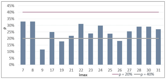 Figure 5 elaborates on the information presented in Figure 4 by demonstrating the occupancy percentage of the vehicle only at the stops where the maximum occupancy was observed. By examining these specific stops, we find that the number of passengers in the vehicle is kept at a fairly low level, well below the level of service change threshold. This means that there are more seats in the vehicle than onboard passengers. Nonetheless, the introduction of social distancing measures would have a negative impact on the Quality of Service, as most of these bus stops would find themselves with an occupancy level that is above the relevant threshold. This suggests that, in the case of such measures, the operator should monitor the demand for bus trips and, if it remains high, then more buses should be employed in order to maintain a high Quality of Service.