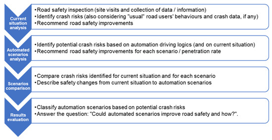 When presenting the potential road safety benefits of vehicle automation most non-expert people tend to make a naïve simplification: today more than 90% of crashes are caused by human errors; if 100% of the vehicles were automated, we would have 90% less crashes. Although worded differently, this sentence has been used many times in different contexts, including being used by then US Secretary of Transportation Anthony Renard Foxx at the annual Automated Vehicle Symposium in 2016 (held in San Francisco on 18–21 July 2016). Even if the introduction of AVs will undoubtedly improve many aspects of road safety, as also proven by some recent research both considering low levels [2] and high levels of automation [3,4], the aforementioned sentence is questionable for several reasons: it does not consider technology mistakes which automated vehicles will make, it does not account for the remarkable human ability to “invent” solutions when under pressure, which considerably limits the number of crashes concerning near misses, and it does not account for any role for infrastructure in causing crashes. Today, the latter often takes place because there is a human (the driver), who always ultimately takes the blame, but this will no longer be possible with automated vehicles. Moreover, it is necessary to investigate how automated vehicles (AVs) will interact with conventional vehicles (CVs) and vulnerable road users, and which will be the road features that will affect road safety in this transition period. The research of Sinha et al. [5] highlights that the safety benefits of AVs are not proportional to AV penetration, and the full-scale benefits of AVs can only be achieved at 100% AV penetration, underscoring that the interaction between AVs and CVs could be a critical issue. The relationship between human drivers and AVs may induce changes in drivers’ behavior [6], which may consequently increase the number of crashes or change the type of expected crashes, as identified by Petrović et al. [7]. In their research, they found that the “rear-end” collision type appears more often in traffic accidents involving AVs and CVs. The topic of the evolution of road safety as a consequence of the introduction of AVs is extremely important and there are many studies nowadays trying to analyze possible future scenarios, both in terms of road infrastructure modifications [8,9,10] and policies and management [11,12]. Nevertheless, the problem of AV safety is not often addressed as a “system” problem but more as a technology issue. No matter how good the technology will be, the system will always play a role. Trying to foresee which will be the main issues for a specific site considering the interaction and coexistence of AVs and CVs may be a key factor in dealing with changing mobility. The coexistence of AVs and CVs (and also between different levels of AVs) is something that must be considered, both because it is not possible to change the entire vehicle fleet in a few days and because some people will prefer to continue using CVs for various reasons, as discussed in the research from Yoo and Managi [13].