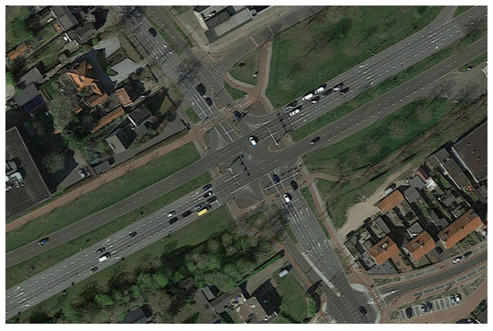 Use Case 3 consists of a signalized intersection with pedestrians and cyclists’ reserved paths, as represented in Figure 2. This intersection is located on an important arterial (N270) that runs through the city of Helmond, Netherland, from east to west and vice versa. In addition, it is located on the west side of the city, and it is one of the first at-grade intersections in the eastbound direction where pedestrians and cyclists can cross the road. The road is classified as an urban road and there are houses and commercial activities around the intersection. The conflicts between vehicles and vulnerable road users at the intersection are controlled by traffic signals and, since pedestrians have a green phase exclusively dedicated to them, there are no secondary conflicts between vehicles and vulnerable road users, whereas the maneuvers required to get access to the surrounding areas are not regulated by signals. No crashes have been recorded at the intersection during the period 2015–2019. The percentage of AVs in future scenarios has been considered equally distributed in all directions.