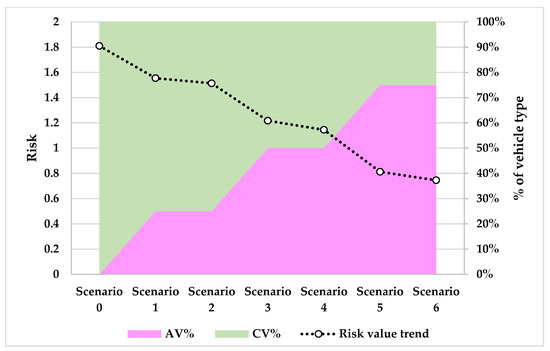 The results of all the scenarios have been summarised in Figure 3. The graph shows the trend in risk for Use Case 3. The graph clearly shows that with the introduction of AVs, the overall safety conditions will improve. The increase in safety is due mainly to the percentage of AVs in the traffic (as can be observed looking at the risk trend between scenarios 0 and 1, 2 and 3, and 4 and 5 in Figure 3), but also to the different driving logics. The advanced driving logic has a generally positive impact on road safety, as can be observed from the risk value of scenarios 1 and 2, 3 and 4, and 5 and 6 (for each couple of scenarios, the traffic percentage is the same but the percentage of vehicles with different driving logics is varied).