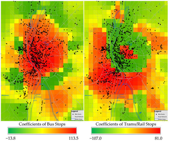 The coefficient values for the bus stops range between −13.8 (Green Zones) and 113.5 (Red Zones). The higher values indicate more concentrated bike-sharing trips at these zones based on the number of existing stops. For the rail/tram stops, the coefficient values range between −107.0 (Green Zones) and 81.0 (Red Zones). Again, higher values indicate more bike-sharing trips at these zones based on the rail/tram stops. We observe that the red zones for both bus and rail/tram stops are distributed in the inner central zones of the city, in addition to the southern-eastern zones. However, there is a difference in the distribution of the coefficients in the outer zones between the bus and rail/tram stops. This is explained mainly by the existence of the rail stations as they attract more riders than the buses, which is in line with the OLS analysis. The negative values do not mean that the number of bike-sharing trips is negative, as there is overlapping between three layers; the coefficients of the bus stops, the coefficients of rail/tram stops, and the intercept values.