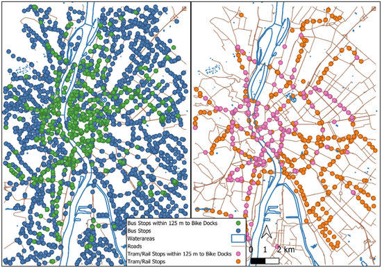 As shown in Figure 2, the central zones are somehow good in the accessibility of public transportation of buses, rails, and trams. It is clearly observable that the neighborhoods need a lot of work in adding bike docks to get more integration between the two systems. More specifically, on the level of 125 m, which is the most acceptable walking distance, the bus stops are accessible by 23.2% of the bike docks in the city as shown by the green dots, while the blue dots mean that these bus stops are not accessible by 125 m of walking distance from the bike-sharing docks. Similarly, the pink dots indicate excellent accessibility to rail/tram stops within 125 m of walking distance from the bike-sharing docks. As mentioned in [16], a better biking infrastructure, more specifically better stations or docks, will lead to more integration and usage of the system of Bike-and-Ride.