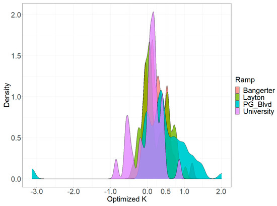 The Ramp Control [Density] model was selected for use in comparison against the optimized model, as this model yielded the best results with respect to the R2 value (closer to 1) and the log likelihood (closer to 0) versus the different linear regression models shown in Table 1. The equation for K that would be produced by the Ramp Control [Density] model is shown in Equations (11)–(14), which has a unique final term in each equation dependent on which ramp is being used. Equation (11) is for Bangerter Highway, Equation (12) for Layton Parkway, Equation (13) for Pleasant Grove Boulevard, and Equation (14) for University Avenue.