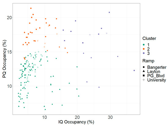The average , the number of observations (n), and the standard deviation (SD) of the data points were calculated for each cluster. Cluster 1, as it is designated in Figure 4, pertains to those time periods where there were both a low PQ and a low IQ occupancy. Cluster 2 represents data points with a high PQ occupancy and low IQ occupancy, while Cluster 3 captures data points that had a high IQ occupancy and either a high or low PQ occupancy.