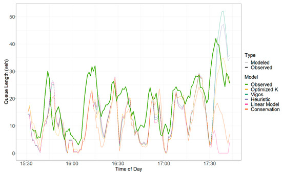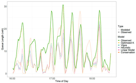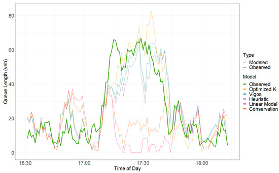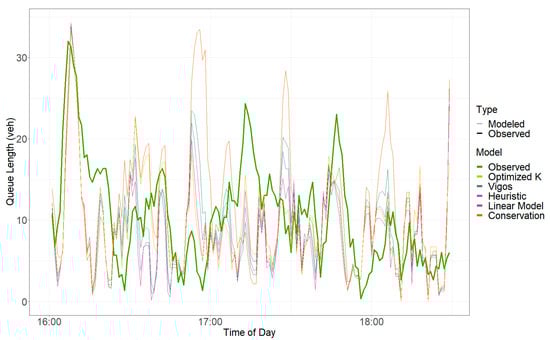 Because each of the models analyzed are variations of the same Kalman filter equation, the models generally follow each other along a similar path, with some variation occurring in the queue length estimates attributed to the variation in . There is some variation in the quality of each model in reflecting the observed queue length. This is particularly evident in the linear regression and conservation models shown in Figure 5, Figure 6, Figure 7 and Figure 8, while the Vigos and heuristic models generally follow the observed queue length more closely.