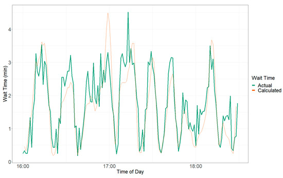 Figure 9 shows that the calculated wait times follow the actual wait times quite well, as nearly every peak and valley throughout the day is captured, and the calculated wait times are generally never more than 30 s above or below the actual wait times during any given minute for this specific application. Therefore, it appears that using the metering rate to convert from queue length into wait time is a reasonable application. In estimating the wait times more broadly, most models used in this research across all ramps and periods throughout each day do tend to slightly underestimate the wait times produced by the conversion used in Equation (15).