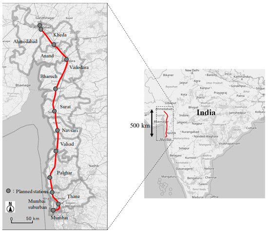 The Mumbai–Ahmedabad high-speed rail (MAHSR), India’s first high-speed rail (HSR), is currently under construction between Mumbai and Ahmedabad near the west coast of India, which is an emerging country with remarkable economic growth. This project is attracting attention as a milestone in the development of a nationwide HSR network in India. HSRs have been developed in many countries and regions, dating back to 1964, when the Tokaido Shinkansen of Japan was opened as the world’s first HSR. The Shinkansen brought about a paradigm shift in the flow of passengers for business and tourism in the 500 km-long metropolis between Tokyo, Nagoya, and Osaka, as well as remarkable economic development and changes in the social environment. The advantages of HSR as a mass means of passenger transportation over this distance are not only the economic benefits due to its speediness but also its environmental advantages in terms of energy efficiency compared to air travel and other modes of transportation [1], making it an effective contribution to sustainable development.